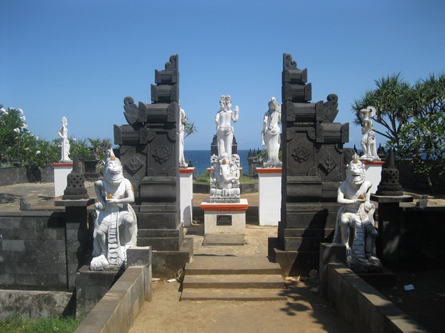 Gerbang depan sebelum turun ke pantai akan disambut oleh kompleks pura yang baru dibangun untuk bersembahyang bagi umat hindu. Mayoritas warga disini memeluk hindu jawa, jadi patung2 penghormatan bagi para dewa pun juga ada yg nerepresentasikan pewayangan jawa.