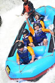 Adventure pun kami mulai. Partnerku ngikut Kang Dilan untuk menuruni perahu karet ke sungai. Lalu, satu persatu anggota timku mulai menaiki perahu karet. Yeay, kita basah-basahan! π BOOM, KANAN, KIRI dan aba-aba lainnya mulai diteriaki oleh Kang Dilan. Ini bener-bener mengasyikan pokoknya!