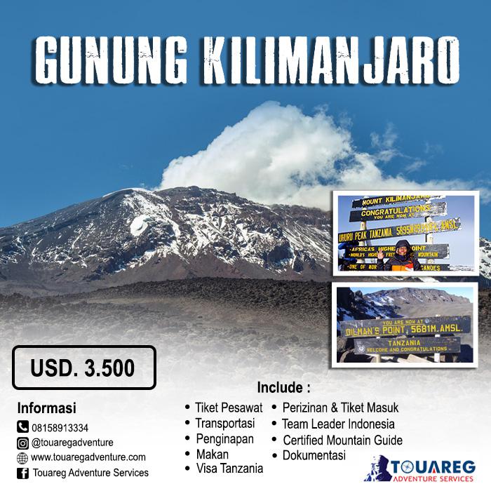 Paket pendakian gunung Kilimanjaro ini adalah salah satu trip adventure spesial Touareg Adventure. Di trip ini kami mengajak anda untuk menikmati sensasi berada di atap Benua Afrika ini yang juga merupakan “7 puncak tertinggi dunia” bersama Mount Everest (Asia), Carstensz Pyramid (Australia-Oceania), Elbrus (Eropa), Aconcagua (Amerika Selatan), Mc Kinley (Amerika Utara), dan Vinson Massif (Antartika).