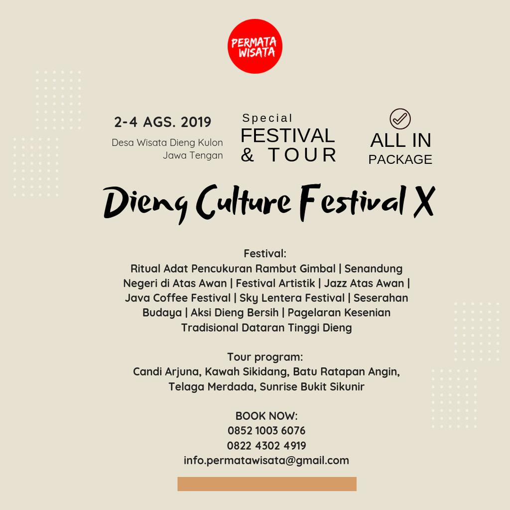 Nikmati festival budaya berskala nasional pada Dieng Culture Festival Ke-10. Sebuah perhelatan budaya yang berlangsung di ketinggian 2200mdpl dan suhu di bawah 5°C, akan menambah kesyahduan event ini.