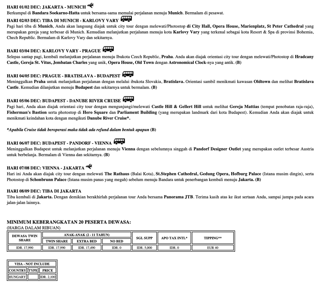 2. Harga tur ke Eropa Timur di Panorama JTB per pax nya (visa included) Rp 20.340.900 tapi hanya untuk twin sharing room, kalau hanya sendirian dikenakan biaya tambahan single supplement 5jt jadi Rp 25.340.900. Jadi ketimbang saya buang uang 5 juta hanya buat twin bed room yang cuma saya sendiri yang pakai mending cari temen jalan yang mau sharing room.