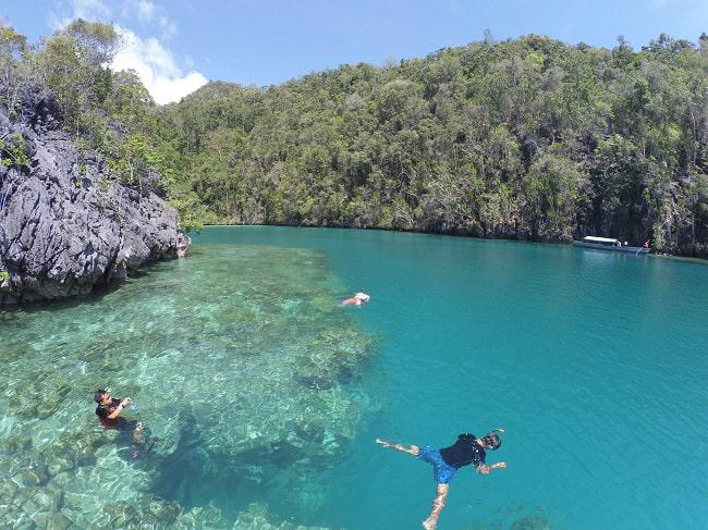 Soalnya, gua yang terletak di tengah-tengah pulau ini dikelilingi oleh air payau. Seru banget, kan bisa berenang di dalam gua. Karena gelap, untuk menikmati keindahan gua kita bisa meminta bantuan pemandu setempat untuk bantuan penerangan berupa senter. Saat memasuki gua maupun berenang, harus hati-hati, ya. Soalnya bebatuan di bawah gua kadang tidak terlihat oleh para traveler yang terlalu bersemangat untuk berenang ke sana kemari. Apalagi saat akan memasuki area gua, batu-batunya sebagian licin terkena air.
