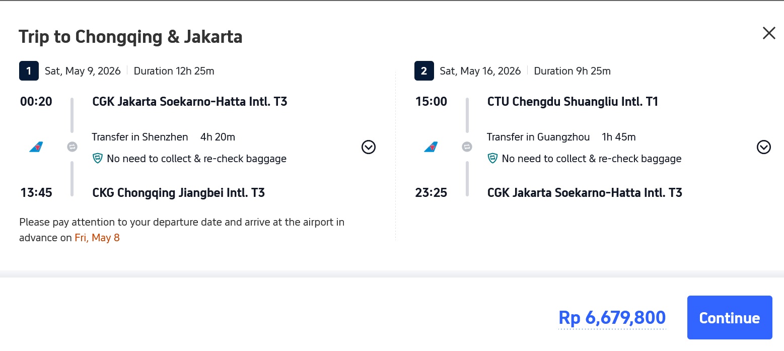 Pulang dari Chengdu : 16 Mei 2026 (sabtu) jam 15:00, transit di Guangzhou 2 jam, sampai Jakarta jam 23:00